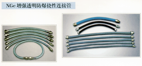 我廠生產(chǎn)的NGe增強(qiáng)透明防爆撓性連接管、防爆標(biāo)志、ExeII防爆合格證號CE001140它除具有同類產(chǎn)品的性能之外,還具有外形美觀、耐用、可撓性好、結(jié)構(gòu)牢固可靠,軟管兩端為鋼制螺紋活接頭,兩端為壓口,表面鍍鋅或鍍鉻。軟管長度與接頭螺紋可根據(jù)用戶要求制作。